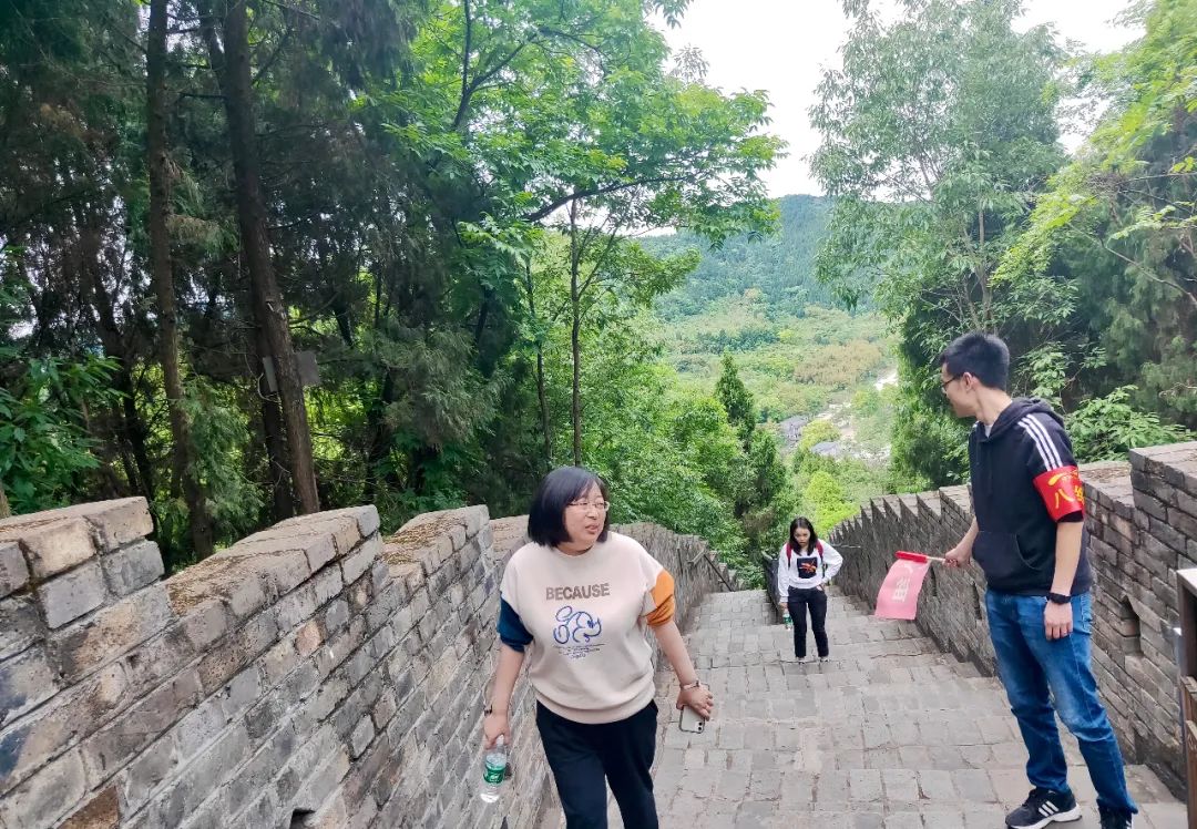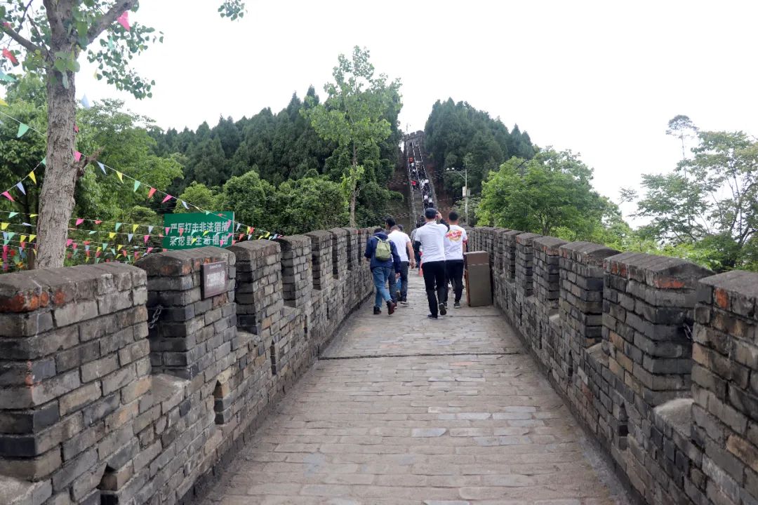 金龍長城全長約1680米,5個烽火臺,伏臥九泉山,從金龍湖景區(qū)大門向山脊延伸,到金龍寺,是中國目前規(guī)模最大的模擬長城。拾階而上,員工們呼吸著新鮮的空氣,感受著大自然的旖旎風(fēng)光,在歡聲笑語中向山頂一路攀登。層層疊疊的大山之中,一條長城之路隨著群山的起伏,蜿蜒而過,直通山頂,部分平時缺乏鍛煉的同事不久便氣喘吁吁,登山健將主動代背行囊,鼓勵的言語讓疲憊的同事再次打起精神,邁開腳步。有些同事一鼓作氣,按照活動規(guī)則,角逐前三,到達登峰,與金龍寺合影留念,成為同事們前行的標(biāo)桿和榜樣。稍作休憩后,又有一些同事繼續(xù)出發(fā),發(fā)揚團隊精神,挑戰(zhàn)自我,問鼎金龍長城,一覽山間風(fēng)景。